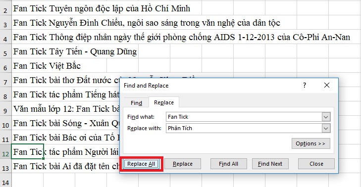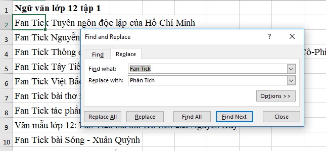 II. Thay thế nội dung trong ô Excel 2019