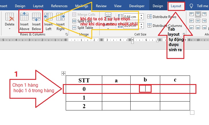 Để thêm 1 hàng bạn chỉ cần chọn vào 1 ô bất kì của hàng mà bạn muốn thêm vào phía trước hoặc phía sau hàng đó. Khi đó 1 tab ribbon có tên là Layout sẽ tự động sinh ra trên menu tab ribbon bạn click vào tab mới sinh ra đó. Trong Group Rows & Columns ta cũng có 2 sự lựa chọn là Insert Rows Above và Insert Rows Below như khi dùng menu chuột phải