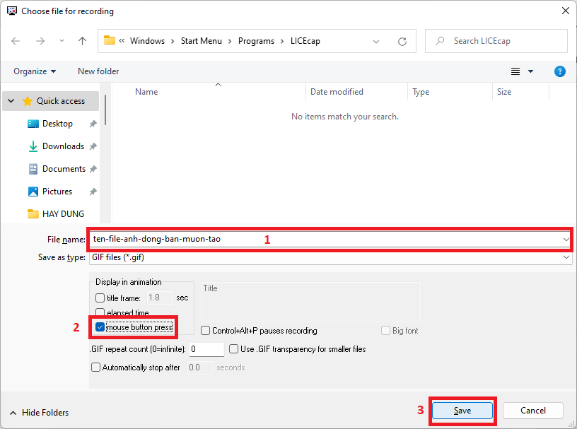 Bước 4: Tìm đường dẫn lưu file và đặt tên cho file (1). Bạn có thể tick chọn vào mục Mouse button press (để tạo điểm nhấn khi click chuột) (2). Sau đó nhấn Save (3) để lưu file và bắt đầu ghi thao tác.