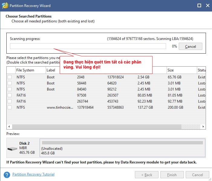 - Bước 6: Partition Recovery Wizard đang thực hiện quá trình tìm kiếm phân vùng bị mất.