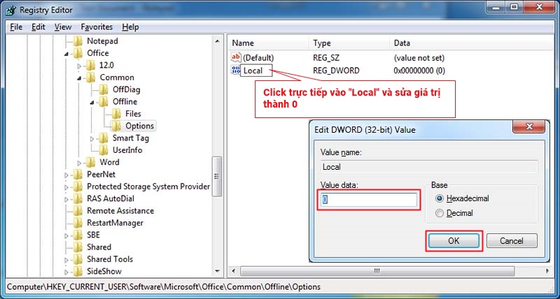 - Bước 2: Duyệt Registry theo đường dẫn [HKEY_CURRENT_USER\Software\Microsoft\Office\Common\Offline\Options]