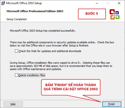 - Bước 9: Bấm Finish để hoàn thành cài đặt Office 2003