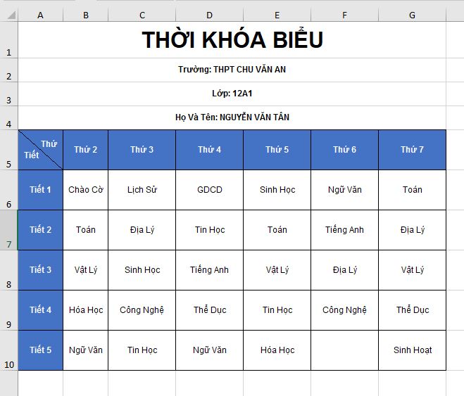 Mẫu số 1: Tạo bảng thời khóa biểu.
