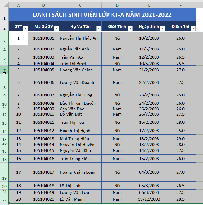 Như các bạn có thể thấy, độ rộng các cột trong bảng là chưa hợp lý. Cột STT thì quá rộng, Cột Họ Và Tên và cột Ngày sinh lại quá nhỏ không hiện đầy đủ dữ liệu. Để căn chỉnh độ rộng cho cột trong bảng ta làm như sau: