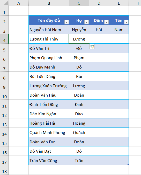 1. Sử dụng Flash Fill để tách Họ, Tên Đệm và Tên