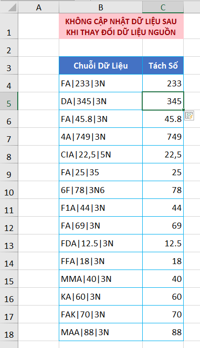 Nếu ta sửa dữ liệu như vậy thì cột dữ liệu ta đã sử dụng Flash Fill trước đó thì flash Fill sẽ không tự dộng cập nhật. Để khắc phục ta chọn ô dữ liệu đầu tiên của cột (Tách số) sau đó nhấn Ctrl + Shift + mũi tên xuống để chọn toàn bộ ô còn lại trong cột sau đó nhấn xóa (Delete).