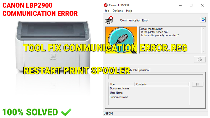 TOOL FIX COMMUNICATION ERROR.REG Thông báo lỗi “Canon LBP2900 Communication Error” thường liên quan đến cổng kết nối giữa máy tính và dây cable USB máy in. Một số cài đặt trong Registry liên quan đến giao tiếp USB của máy in có thể bị sai lệnh hoặc hỏng gây ra lỗi Communication Error trên máy in.