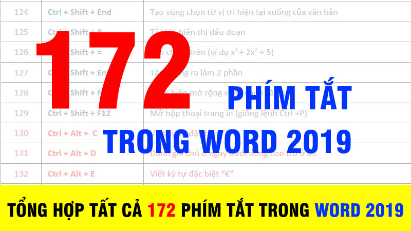 Sử dụng phím tắt trong Word sẽ giúp tăng tốc xử lý văn bản, nếu bạn chưa biết đến các phím tắt trong Word này thì thật là một thiếu sót lớn. Dưới đây chúng tôi đã tổng hợp tất cả 172 phím tắt trong Word 2019 sẽ giúp bạn tiết kiệm rất nhiều thời gian trong việc soạn thảo văn bản và trở nên chuyên nghiệp hơn rất nhiều.